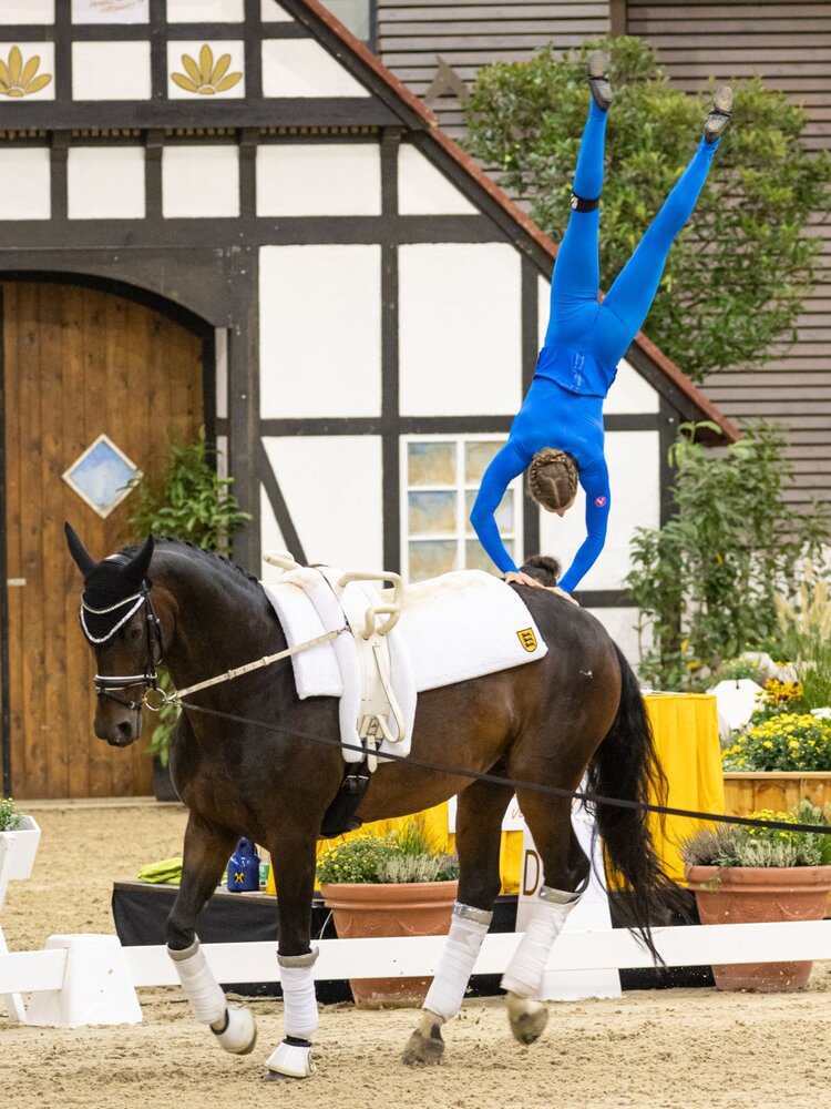 Die U21-Europameisterin Alice Layher zeigte am Wochenende, dass sie nicht nur in ihrer Altersklasse zu den besten Voltigiererinnen Deutschlands zählt. Nach Technik und Pflicht rangierte das Nachwuchstalent aus Brackenheim schon auf einem sensationellen vierten Platz. In der finalen Kür lieferte sich noch einmal ab, was mit tollen 8,476 Punkten belohnt wurde. In der Gesamtwertung sicherte sie sich einen spitzen vierten Platz. Auch wenn es der undankbare vierte Platz war, ist das weniger als Misserfolg, sondern viel mehr als großer Erfolg einzustufen. Das Rennen um die Goldmedaille war mehr als knapp. Kathrin Meyer turnte in der Kür auf dem Rücken von San Classico zu sensationellen 9,089 Punkten. Dies reichte in der Kür zum Sieg. In der Meisterschaftswertung wurde es jedoch die Silbermedaille knapp hinter Julia Sophie Wagner, die sich in der Kür mit 8,724 zum dritten Platz turnte. Alina Roß durfte sich am Finaltag mit 8,938 Punkten über den zweiten Platz freuen. In der Gesamtwertung rangierte sie auf dem Bronzerang. (msb)