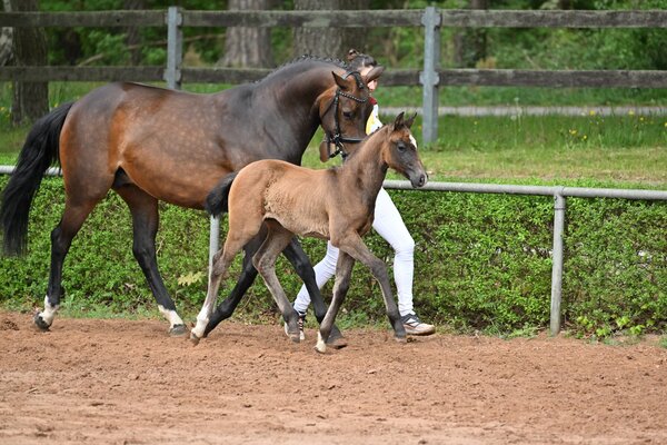 Zur Preisspitze avancierte ein Stutfohlen mit berühmter Verwandtschaft: Bei 20.000 Euro fiel der virtuelle Hammer für die Tochter des Calidrio mit dem Auktionsnamen „Charlbury“. Vollschwester der Mutter von Askari-Heraldik xx des bewegungs- und typstarken Fohlens, das die in Kalbe/Milde in Sachsen-Anhalt ansässige Pietscher GbR ausstellte, ist SAP Asha P, in deren Sattel Ingrid Klimke 2020 ihren fünften Deutschen Meisterschaftstitel gewann. Außerdem ist der gekörte DSP Araldik Vollbruder der Fohlenmutter, und Van Hera P, mit der Ingrid Klimke in diesem Jahr bereits das CCI3*-S in Münster gewinnen konnte, ist ihre Halbschwester. Von einer sportlichen Karriere Charlburys kann man ausgehen, sie wurde ebenso einem renommierten Vielseitigkeitsausbilder zugeschlagen wie die Nummer zwei im Preisranking, ein weiteres Stutfohlen mit dem Auktionsnamen „Christchurch“. Für 17.500 Euro ging diese, von Stephan und Frauke Voss im baden-württembergischen Weißbach gezogene Tochter des Cornet de Semilly aus einer Chriron xx- Full Speed-Mutter an DSP-Kunden aus den Niederlanden. Ihrem Stamm sind zahlreiche gekörte Hengste ebenso wie auf internationalem Parkett erfolgreiche Dressur-, Spring- und Vielseitigkeitspferde zuzuordnen.