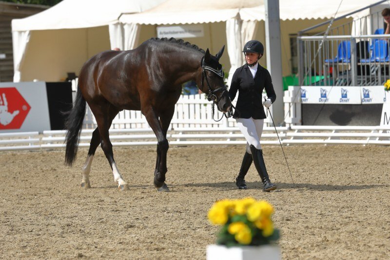 „Man versucht cool und konzentriert zu bleiben, aber natürlich war ich auch aufgeregt.“ beschreibt Lisa Casper die Stimmung vor ihrem ersten Start im Hexenkessel des Warendorfer Reitpferdevierecks. Als Ziel hatte sich Lisa Casper gesetzt, eine „schöne, souveräne Runde zu reiten“. Die drehten die beiden nun auch. Im Feld der vierjährigen Stuten und Wallach erhielt der Rappwallach eine Endnote von 7,8 und setzte sich damit ins Mittelfeld. Die Richter hatten alle Einzelnoten mit 8,0 oder besser bewertet. Lediglich die Schrittnote schlug mit 6,5 negativ ins Gewicht. „Ich weiß, dass Sir Copperfield im Schritt ein Manko hat. Mir war bewusst, dass es mit diesem Schritt auch schwer wird ins Finale zukommen. Aber natürlich habe ich insgeheim darauf gehofft.“ gibt Casper ehrlich zu. Zu dem Secret-Sohn pflegt Lisa Casper eine ganz besondere Beziehung. Als Fohlen hatte Papa Thomas Casper den Rappen mit dem markanten Fleck auf den Nüstern entdeckt und bereits Anteile an dem vielversprechenden Fohlen gesichert, mittlerweile steht Sir Copperfield vollkommen im Besitz des Birkhof-Gestütschefs. Dementsprechend wuchs der Wallach auf dem Donzdorfer Gestüt auf, wurde dreijährig dort aufgestallt und angeritten. „Als Sir Copperfield das vierte oder fünfte Mal unter dem Sattel war, habe ich übernommen. Er ist das erste junge Pferd, dass ich von so früh an begleiten durfte. Das macht den Start hier natürlich ganz besonders für mich.“ erklärt Lisa Casper stolz.