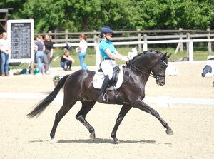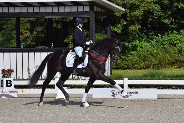 Heute zeigten der DSP-Hengst und Nicola Haug eine starke Runde. Besonders in der Trabtour glänzte der Morricone I-Foundation-Sohn (Z.: Reinhold Marschall, B.: Thomas Casper) wieder einmal: ausdrucksvoll, stets durch den Körper und mit toller Rahmenerweiterung in den Verstärkungen - 8,5. Die 8,5 gab es auch für den Schritt und den Gesamteindruck, der Galopp wurde mit 8,0 bewertet, ebenso die Durchlässigkeit. Insgesamt schlug damit eine Endnote von 8,3 zu Buche - machte Rang vier in der zweiten Abteilung! Neben einer Schleife sicherte sich das baden-württembergische Paar damit auch den direkten Finaleinzug! (mst)