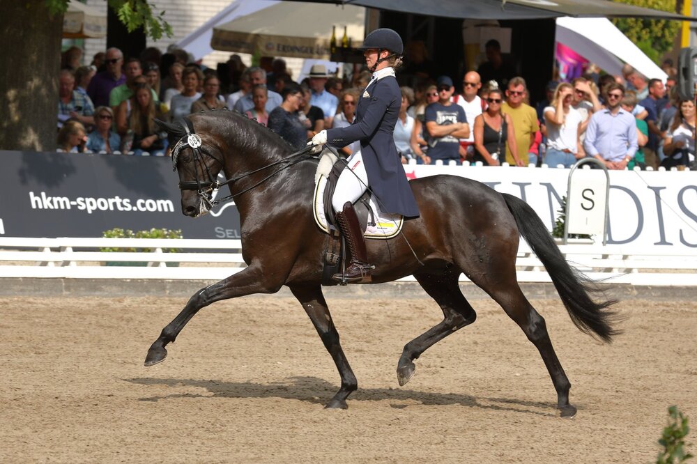 Die Altersklasse der siebenjährigen Dressurpferde ist in diesem Jahr neu auf den Warendorfer Bundeschampionaten. Zwei Dressurpferdeprüfungen der Klasse S müssen dafür bewältigt werden, es gibt sowohl die aus Reitpferde- und Dressurpferdeprüfungen bis Klasse M bekannten Einzelnoten, aber auch eine Technik-Note in Prozent, wie aus einer regulären Dressurprüfung der Klasse S. Daraus errechnet sich eine weitere Prozentzahl, die über den Sieg entscheidet. Das neue Angebot in Warendorf nutzten auch zwei Paare aus Baden-Württemberg. Zum einen war das Anna-Lisa Stotmeister aus Allensbach mit ihrem Hannoveraner Best of Bond. „Ich wollte mein Pferd einfach in der bestmöglichen Weise in seinen Möglichkeiten präsentieren.“ machte Anna-Lisa Stotmeister ihre Ambitionen für die Woche klar. Das gelang Stotmeister mehr als gut: Mit einer Endnote von 76,594 Prozent platzierte die Dressurreiterin den Sohn des Bordeaux auf Rang drei der zweiten Abteilung in der Finalqualifikation.