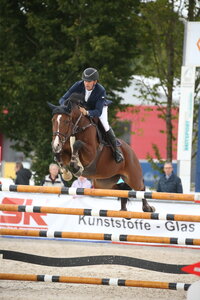 Frisch mit dem goldenen Reitabzeichen sowie mit weiteren S-Siegen ausgestattet ritt Michael Herhalt heute im ersten S-Springen des großen Herbstturniers auf dem Gestüt Sengelen in Schopfheim wieder allen davon. Im Sattel seiner zehnjährigen Schimmelstute Bella Donna zeigte er eine saubere Nullrunde in einer Zeit von 61,72 Sekunden. Das Turnier ist gut von Schweizer Gastreitern besucht. Allen voran sicherte sich Timo Heiniger gleich drei Platzierungen. Mit seiner achtjährigen Stute Ginja zeigte er zwar eine starke Nullrunde, an die Zeit von Michael Herhalt kam er jedoch nicht heran. So sicherte er sich mit 62,07 Sekunden den zweiten Platz. Auch auf dem dritten Platz fand man den Schweizer mit seinem Conner Ege (62,68 Sekunden). Auf Rang vier folgte mit Walter Gabathuler ein weiterer Schweizer, der ebenso eine Nullrunde mit 66,19 Sekunden zeigte. Der für den gastgebenden Verein startenden Felicitas Funk gelang mit einer Nullrunde in 71,07 Sekunden und dem fünften Platz ebenso eine schöne Platzierung. Als Letztplatzierter ritt der Schweizer Timo Heiniger ein drittes Mal in die Platzierung.
