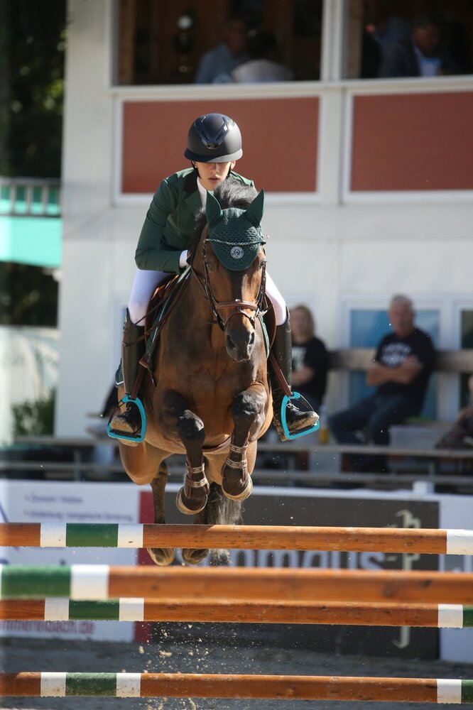 Sie sammelt Neuner-Noten wie andere Mädchen Barbie-Puppen: Cecilia Huttrop-Hage vom Gestüt Albführen hat in Walldorf-Winterheck erneut die Qualifikation zum Nürnberger Burg Pokal der Springreiter-Junioren gewonnen, diesmal auf dem eleganten Westfalen Sir Shutterfly Sein Sohn. Die Jury, bestehend aus Irene Loucke und der Pfälzerin Barbara Landin, vergab für die Bilderbuchrunde eine 9,3. Damit hat die 15-jährige „Sissy“ Huttrop-Hage dreimal hintereinander eine Qualifikation mit einer Traumnote gewonnen – drei Starts, drei Siege. Damit gehört sie beim Finale in Stuttgart im November klar zu den Favoriten.