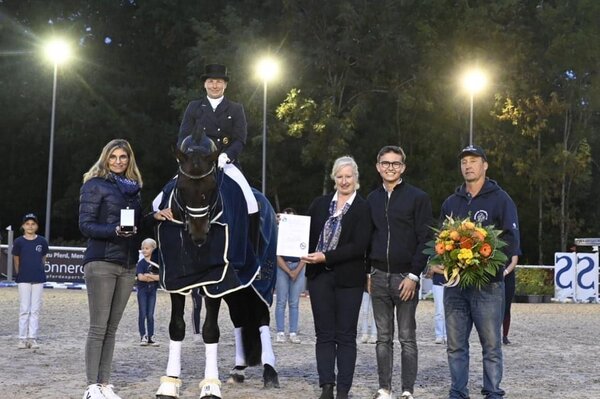 Sie stammt vom Bodensee, war lange Jahre bei Freiburg ansässig und ist immer noch waschechte Baden-Württembergerin, obwohl sie seit vier Jahren in der Schweiz lebt: Myriam Anhalt, Berufsreiterin und - ausbilderin vom Schweizer Dressurzentrum Grabs hat am Wochenende beim Turnier in Schopfheim ihr Goldenes Reitabzeichen verliehen bekommen. Der Standort Schopfheim im Oberrhein war ihr Wunsch. Das Hausturnier der Familie Trefzger im Gestüt Sengelen ist ihr Lieblingsturnier. Die Verleihung durch Südbaden-Präsidentin Iris Keller fand abends unter Flutlicht statt. Die Laudatio hielt Andrea Schöler, die seit Jahren eine Wegbegleiterin von Myriam Anhalt ist. Es war ein Heimspiel für die frisch Geehrte.