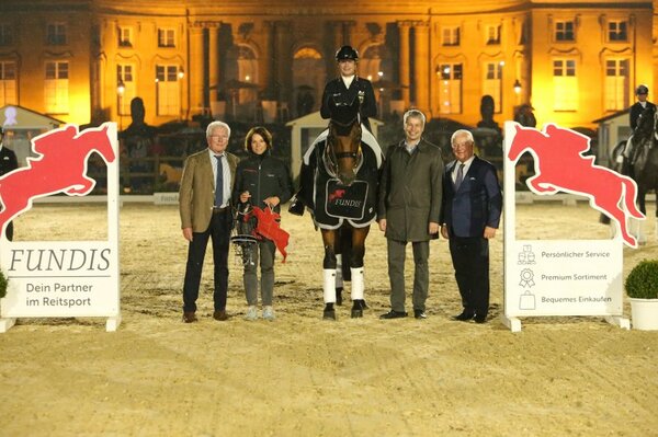 Zweiter wurde Benjamin Werndl mit seinem 18-jährigen Westfalen Daily Mirror aka Ken. Auch dieser Wallach weiß sich unter Flutlicht vor dem beleuchteten Schloss Monrepos zu präsentieren. Sein Reiter hatte die bekannte Kür zu afrikanischen Klängen ausgewählt und ließ seinen Rappen glänzen. Nach der Grußaufstellung in die Galopp-Pirouette, danach rhythmische Zweierwechsel auf gebogener Linie. Mindestens 19 flüssige Einerwechsel und ein raumgreifender starker Schritt setzten weitere Höhepunkte, ebenso die sehr gesetzten Galopp-Pirouetten: 82,155 Prozent.