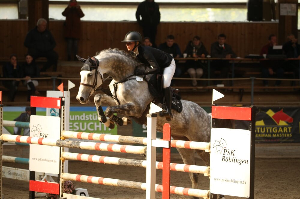 Langeweile am Feiertag gibt`s beim Böblinger Reitverein nicht. Nach extremen Regenfällen blickten die Vereinsmitglieder in den frühen Morgenstunden auf einen unter Wasser stehenden Prüfungsplatz. An ein Bereiten war nicht zu denken. Nach kurzem Überlegen packte das eingespielte Helferteam an und verlegte den Parcours in die Halle. Eine tolle Aktion, die nur mit den entsprechenden Möglichkeiten vor Ort sowie einem guten Helferteam umsetzbar ist. Auch bei der letzten Qualifikation des Nürnberger Burgpokals der Junioren wurde es nicht langweilig. Einige Favoriten patzten und manche Pferde waren von der Hallenkulisse sichtlich beeindruckt. Daraus resultierten einige Steher sowie Abwürfe, was man vom rekordverdächtigen Niveau der diesjährigen Junioren bisher nicht gewohnt war. Sarah Chiara Ott und ihre sehr engagierte und überragend springende Stute Afterglow ließen sich von alle dem nicht beeindrucken. Die junge Dame vom Reitsportzentrum am Bussenberg zeigte eine sehr gleichmäßige Runde, bei welcher sie das hohe Engagement ihrer Stute zu jeder Zeit gefühlvoll in die richtigen Bahnen lenkte. Der Lohn war eine tolle Wertnote von 8,2 sowie der Sieg in der letzten Qualifikation. „Afterglow ist generell nicht ganz einfach, weshalb es mich sehr gefreut hat, dass sie die heutigen Aufregungen so gut mitgemacht hat und dann im Parcours einfach alles gepasst hat“, beschreibt die stolze Siegerin. Im Finale wird sie nicht mit ihrem Nachwuchspferd Diarano starten, sondern auf ihre Afterglow setzen. Auf Platz zwei setzte sich wiederum Vanessa Kölz mit Celia und einer 8,0 durch. Damit bestätigte die Nichte von Markus Kölz ihre sehr konstante Form der Saison und wird nun als Führende ins Finale einziehen. Lenny Maier legte im Sattel seiner Lylly de Baloubet gleich als erster Starter vor und setzte sich mit einer 7,6 lange an die Spitze des Feldes. Am Ende reichte es für den dritten Platz und sammelte wertvolle Punkte für sein Gesamtkonto. Vor der letzten Station in Böblingen rangierte er auf dem elften Platz der Gesamtwertung und kann nun die Koffer für Stuttgart packen. Chiara Ebrahimi, Thierri Wagner und Jana Prasser überzeugten ebenso, mussten jedoch alle drei jeweils einen Abwurf in Kauf nehmen. Für Chiara Ebrahimi reichte es mit ihrer hübschen Dragon Queen und einer Endnote von 7,6 auf den vierten Platz. Thierri Wagner und Jana Prasser teilten sich mit einer Endnote von 7,5 den fünften Platz.