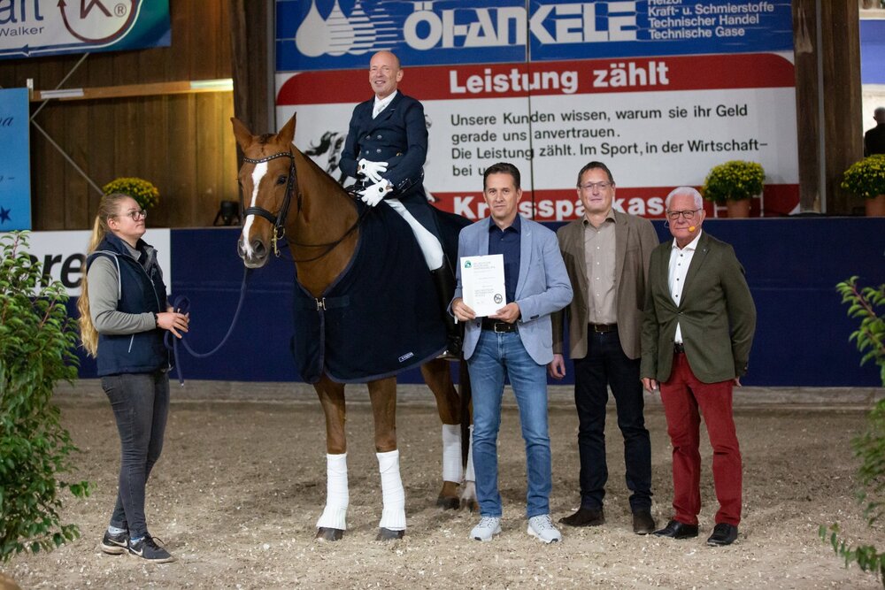 Das Goldene Reitabzeichen zu verdienen ist für jeden Reiter ein besonderes Ereignis – für einen lupenreinen Amateur kann man einen solchen Erfolg gar nicht hoch genug bewerten. Markus Schetter aus Waiblingen hat es mit seinen aktuellen Erfolgen geschafft und gestern Abend in einer großen Feier von Frank Reutter und Verbandspräsidenten Klaus Dieterich das Goldene Reitabzeichen verliehen bekommen. Nach einem kleinen Film kam Markus Schetter flankiert von seinen engsten Wegbegleitern in die Halle, die mit über 100 geladenen Gästen über eine volle Tribüne und beste Stimmung verfügte. Es folgte eine Laudatio von keinem geringeren als dem Turnierleiter Gotthilf Riexinger, welcher die Anfänge und Erfolge von Markus Schetter Revue passieren ließ. Die Erfolge des erfolgreichen Unternehmers und Reitsport-Förderers verteilen sich auf die vergangenen elf Jahre, seinen ersten S-Sieg schaffte Schetter schon 2011 in Jettingen, damals mit seinem ersten S-Pferd Rhodon. Der wichtige Zwei-Sterne-Sieg gelang dann 2017 in Aulendorf, ebenso schon mit seinem immer noch aktuellen Erfolgspferd Dont stop moving, den er auch bei der Verleihung des Goldenen Reitabzeichens vorstellte. In seinem Sattel gehörte Schetter auch zu den Finalisten des IWEST-Cups in Stuttgart. Mit dem Lusitano Dirigivel kann Schetter auch Drei-Sterne-Platzierungen aufweisen. „Ich bin unglaublich stolz und dankbar. Mein großer Dank geht an all meine Pferde und natürlich meine Familie“, beschrieb Markus Schetter bei der Verleihung. Markus Schetter, der Mitglied im baden-württembergischen Dressurausschuss ist, ist von Reitern umgeben. Auch seine Frau Andrea reitet S-Dressuren, seine Schwester Karen Tebar ist für Frankreich schon Olympische Spiele geritten. Vater Willy ist der Grandseigneur der baden-württembergischen Dressurszene. Natürlich waren bei der Verleihung des Goldenen Reitabzeichen alle dabei und die ein oder andere Träne floss auch. (msb)