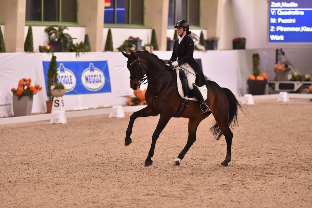 Zwei Damen aus dem Ländle für MünsterHinter diesem starken Spitzentrio folgte ein nicht weniger starkes Duo aus dem Ländle. Meike Lang und ihr zehnjähriger Württemberger Ferrabeau (Z.: Anja Riß) rangierten auch heute mit 71,6 Prozent auf dem vierten Platz, dabei sah sie ein Richter sogar auf dem zweiten Platz. Der großrahmige Wallach begann energisch mit einer ausdrucksstarken Trabverstärkung und fließenden Trabtraversalen. Die Piaff Passage Tour zeigte sich auch heute energisch nach oben abfußend sowie schon sehr gesetzt. Besonders in der Piaffe findet Ferrabeau noch nicht immer zu optimalen Balance, wodurch er teilweise in der Vorhand etwas schwankt. Im Vergleich zur Einlaufprüfung zeigte sich die Schritttour verbessert, jedoch noch nicht optimal losgelassen und mit großem Übertritt. Auch heute brillierten die Beiden mit einer sehr sicheren Galopptour, in welcher es einige Höhepunkte zu sehen gab. Beispielsweise gelangen sowohl die Zweier- als auch Einerwechsel schnurgerade und ins Bergauf gesprungen. Die Galopppirouetten zelebrierte Meike Lang auf kleinstem Kreis und mit guter Lastaufnahme, teilweise könnte der Wallach noch besser vor dem inneren Bein stehen, durchspringen und demnach noch mehr Last aufnehmen. Mit diesem tollen vierten Platz in einem auch heute enorm starken Starterfeld sicherten sie sich ein Finalticket. Dies machte auch eines der Überraschungspaare der Saison, Madlin Zott und ihre zehnjährige Württemberger Stute Quadrofina (Z.: Klaus Pfrommer) (71,2 Prozent). Die beiden punkteten sich mit toll abfußenden Passagen, aktiven Piaffen sowie sicheren Zweierwechseln zum fünften Platz. Trotzdem die Stute teilweise vom Licht und Schatten Wurf auf dem Hufschlag irritiert war, zeigte sie sich heute in der Oberlinie losgelassener und ließ sich von ihrer Reiterin stets zur guten Mitarbeit überzeugen. In den Galopppirouetten nimmt die Stute gut Last auf, könnte jedoch teilweise noch besser durchspringen. Auch zum Ende der Einerwechsel schlichen sich Fehler ein. Hinter Zott folgte Uwe Schwanz im Doppelpack. Der bayerische Erfolgreiter rangierte mit dem neunjährigen DSP-Wallach Dhamani und 71,2 Prozent Rang sechs sowie mit dem achtjährigen Wallach Don Lauris und 71,1 Prozent Rang sieben. Cosima von Fircks und Nymphenburg´s Easy Fellow sicherten sich das letzte Finalticket und rangierten mit 69,4 Prozent auf dem achten Platz. Nicole Isser, Anna-Louisa Fuchs und Ines Knoll folgten mit ebenso guten Runden, jedoch teuren Fehlern, auf den letzten drei Plätzen. (msb)