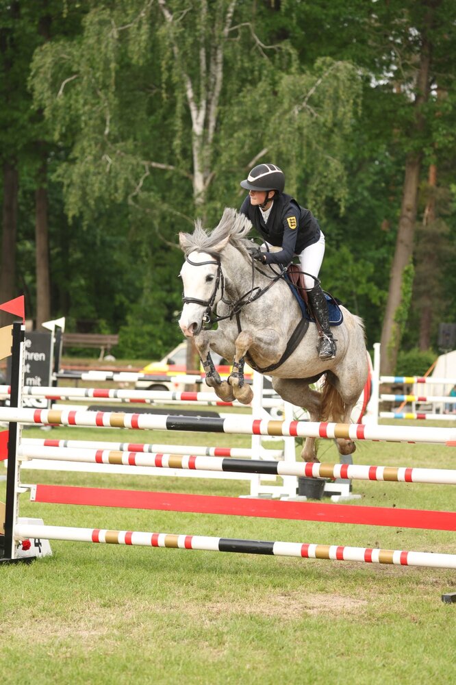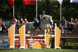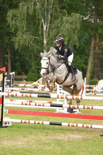 In Weingarten fand am Wochenende die nächste Station des Pony Spring-Master statt. Vroni Grüber stellte hier zwei Ponys vor, die sie noch gar nicht so lange unter dem Sattel hat. Nur vier Teilnehmer hatten sich überhaupt für das L-Springen angemeldet. Im Sattel der sechsjährigen Del Piero-Tochter Despina konnte Grüber das Springen mit einer fehlerfreien Runde für sich entscheiden. Seit Anfang des Jahres hat sie die Schimmelstute unter dem Sattel, es ist der erste gemeinsame L-Sieg der Beiden. Erst seit April sitzt sie im Sattel des neunjährigen Wallachs Quietschfidel. Der Braune stützt sich teilweise noch haltsuchend auf die Reiterhand, am Sprung lässt er jedoch viel Platz. So wurde es ebenfalls eine fehlerfreie Runde und Platz zwei. Valerie Eisele unterlief ein Abwurf, damit wurde sie Dritte vor der Altenheimerin Malena Mild mit Camelot de Blonde, bei der vier Stangen fielen. (mj/Foto: Matthaes)