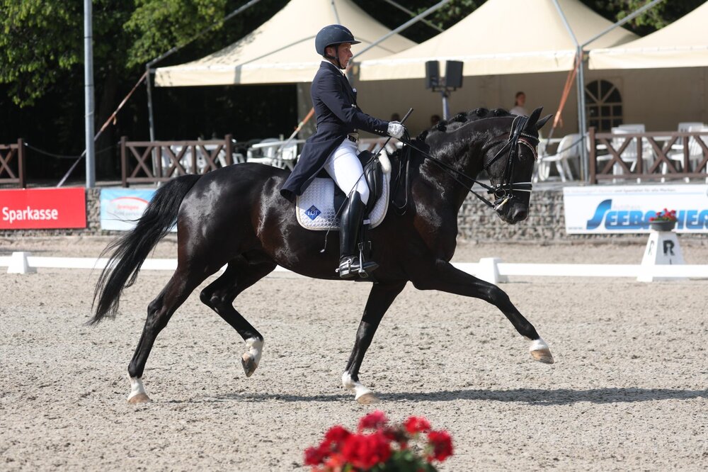 Myriam Anhalt hat einen Lauf und bleibt bei den Ichenheim Classics Dressage auf ihrer Erfolgswelle. Nach ihrem Sieg in der ersten S-Dressur setzte sie sich auch im St. Georg Special, der Qualifikation für die morgige Intermediaire I, durch. Im Sattel ihres elfjährigen Wallachs Best Friends überzeugte sie mit einer äußerst gleichmäßigen Runde mit Highlights in den Verstärkungen, Traversalen sowie Galopppirouetten, was die Richter mit 69,7 Prozent belohnten. Im letzten Jahr zeigte sich Best Friends noch äußerst schwierig und ließ sich auf dem Turnier schnell von der Umwelt ablenken. Über den Winter hat Best Friends an Selbstsicherheit gewonnen und Myriam Anhalt hat ihn nun zu einem S-Sieger geformt. Auf den zweiten Platz setzte sich die noch amtierende Amateur-Landesmeisterin Christine Eberbach im Sattel ihrer routinierten elfjährigen Donna de Luxe (68,4 Prozent). Auch auf den weiteren Plätzen wurde es eng. Myriam Anhalt reihte sich im Sattel ihres zweiten Pferdes Rocco Granata auf Rang drei ein (68,1 Prozent). Die Plätze vier und fünf sicherten sich Freya Bistritz mit Amarillo (67,6 Prozent) und Leonie mit Harry Potter (67,6 Prozent).