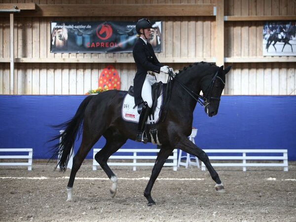 In einem bärenstark besetzten Feld in der Kleinen Tour von Zeutern hat sich die Weinsbergerin Ann-Kathrin Lindner mit ihrem Württemberger Sunfire (Foto: Doris Matthaes) stark geschlagen: Sie wurde mit fast 72 Prozent der Punkte Fünfte in der "Inter I" am Ostermontag, einer Zwei-Sterne-Prüfung". Der große Rappe aus der Zucht von Volkmar André hat sich über Winter im Training bei Reitmeister Karl-Heinz Streng weiter gesteigert.