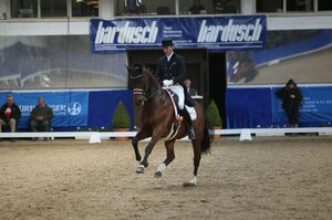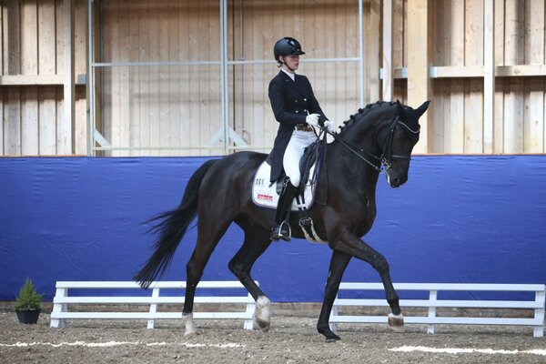Einen schwarzen Tag erlebte Nicole Casper. In der Abreitehalle war ihr Birkhof's Topas FBW noch topfit. Im Viereck zeigte der Totilas-Sohn dann aber wiederholt Taktstörungen, was zum Abläuten führte. (FA)