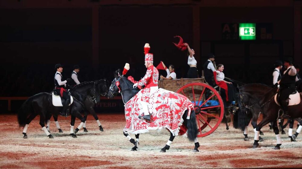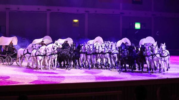 Gänsehaut verursacht die Europa-Quadrille, bei der Hengste der berühmten Landes- und Nationalgestüte gemeinsam die Arena betreten: Marbach, Schwaiganger, Ebbs in Tirol, und Kladruby in Tschechien. Toni Kreidel geleitet mit österreichischem Charme die Besucher durch weitere Länder und Themen, etwa zu den Gladiatoren ins alte Rom und in den tiefen Wald, wo die Holzfäller wie eh und je mit Pferden arbeiten. Auszubildende des Haupt- und Landgestüts in Marbach schwangen als Schwarzwaldmädels das Tanzbein. Das war große Klasse!