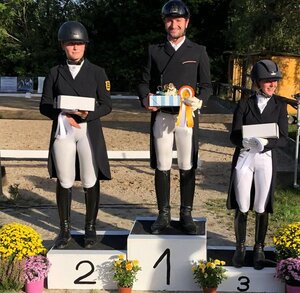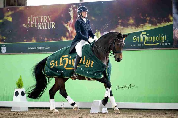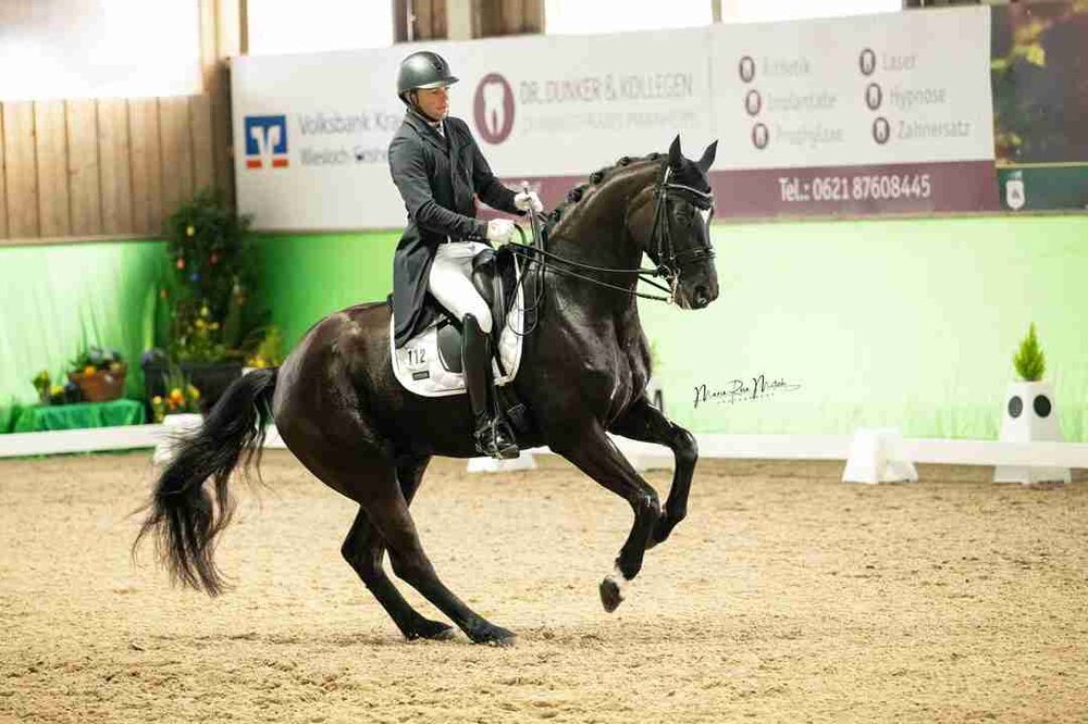 Der Sieg mit 72,3 zur 71,8 Prozent vor der Vortagessiegerin Anja Plönzke mit Fahrenheit fiel zwar knapp aber verdient aus. Einen besonders starken Eindruck hinterließ Timo Kemmerers Nachwuchspferd Dante Zazou aus eigener Zucht. Der jetzt zehnjährige Rappe ist ein Bewegungswunder, in den Pirouetten setzt er sich wie aus dem Bilderbuch, und das ganz ohne Spannung. Seine weitere Saison im großen Viereck kann mit Spannung erwartet werden. In Nordbaden geht die Grand Prix-Saison ja jetzt fließend weiter: Erst in Zeutern an Ostern, dann in Pforzheim. Annett Böhm aus Bretten lieferte mit ihrem 14-jährigen Blackmoney wieder eine grundsolide Vorstellung ab und rangierte auf Rang vier.