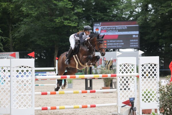 Mit zwei fehlerfreien Runden hat sich Katharina Dietrich vom RV Singen mit ihrer zehnjährigen Westfalenstute Carthusia an die Spitze in der Meisterschaftswertung der Südbadischen Meisterschaften der Jungen Reiter gekämpft. Die Meisterschaften werden an diesem Wochenende im Rahmen der Ichenheim Classics auf der Waldreitanlage des Reitervereins Ichenheim ausgetragen. Auf Rang zwei liegt derzeit Ben Dreher vor Lara-Sophie Strohm.