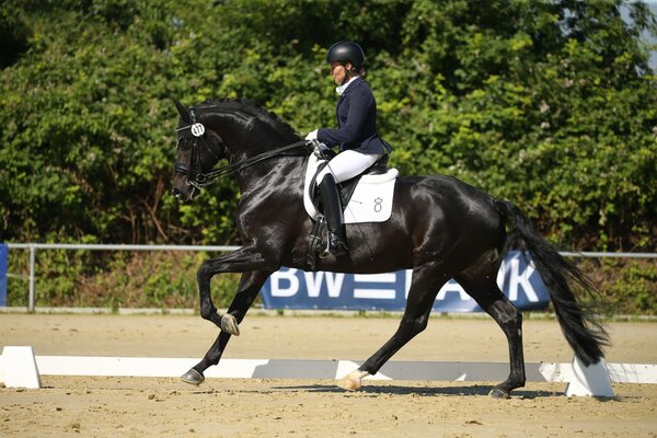Er macht seinen Weg, vom Prämienhengst über den Landessieg in Oldenburg und die Weltmeisterschaften der jungen Dressurpferde – bis zum S-Sieger. Der siebenjährige Hengst Santo Dottore hat in Ladenburg mit seiner Ausbilderin Katrin Burger mit einem veritablen Ergebnis von 72,5 Prozent seine erste S-Dressur gewonnen. Dabei war das Feld stark besetzt: Thomas Wagner belegte mit Ritmo Royal Rang zwei, Olympiasiegerin Dorothee Schneider blieb mit dem Oldenburger Freispiel auf Rang vier zurück. Dazwischen platzierte Simone Kinzinger vom Hammberger Hof in Sinsheim den achtjährigen Dubai Diamond auf Rang drei (rok).