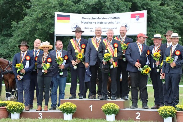 Das muss ihm erstmal einer nachmachen: Mit dem Sieg in der dritten Teilprüfung Kegelfahren und damit dem Sieg in allen Einzelwertungen holt sich Steffen Brauchle seinen 15. Deutschen Meistertitel im Pony-Vierspänner. 31,4 Punkte Vorsprung hatte Brauchle vor dem Finale. Scheinbar ruhig ließ er es angehen, fuhr zunächst auf Sicherheit. Doch es sah langsamer aus, als es tatsächlich war, am Ende hätte er es sogar fast in die Zeit geschafft. Und die Bälle blieben auch alle liegen. Der Pforzheimer Patrick Harrer gewann mit Platz zwei im Kegelfahren die Silbermedaille in der Deutschen Meisterschaft. 2023 hatte er Bronze gewonnen und freute sich riesig, wieder auf dem Treppchen stehen zu dürfen. Zumal sich bei der Anreise eines seiner Ponys verletzte und er kurzfristig von zuhause Ersatz-Pony Montana holen musste. "Ich war da wirklich sehr angespannt, weil das Pony momentan nur im Einspänner trainiert wird und ich nicht sicher war, ob das klappt. Aber es hat super mitgemacht", erzählte er stolz. "Das alles erleben zu dürfen, ist für mich etwas sehr Besonderes. Ich habe das Gespann erst vor vier Jahren übernommen und bin so glücklich, was wir alles erreicht haben." Bronze ging an Michael Kolata aus Schönebeck. Der Sieg im Länderpokal der Pony-Vierspänner ging ebenfalls an Baden-Württemberg mit dem Team aus Steffen Brauchle, Patrick Harrer und Anne Hürster.