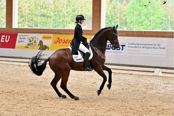 Marcel Wolf vom RFV Bad Waldsee komplettierte das Podium mit seinem 14-jährigen Hannoveraner-Wallach Fabiano. Das Paar erreichte eine Wertung von 69,744 Prozent.