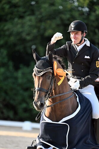 Am gestrigen, ersten Turniertag stand beim großen Dressur- und Springturnier auf dem schönen Gelände des Waldhauser Hofs auch schon das erste ganz große Highlight an. Die Rede ist von der ersten S***-Prüfung des Turniers. Dabei tanzten die Baden-Württemberger den bayerischen Erfolgsreitern gehörig auf der Nase herum und Frederik Leon Steisslinger sowie Maren Schatz machten den Sieg unter sich aus. Zweitere legte gleich als erste Starterin eine starke Messlatte und lieferte im Sattel ihres 13-jährigen Westfalen Sacramento eine sichere Runde. Mit Highlights in aktiv abfußenden Piaffen sowie einer technisch sicheren Galopptour punktete sie sich zu 69,3 Prozent. Sollte das für den Sieg reichen? Lange sah es so aus. Doch dann kam der Böblinger Frederik Leon Steisslinger. Nachdem sein letztjähriger Erfolgspartner Quattani verletzungsbedingt ausfällt, entwickelte sich in der Familie Steisslinger eine schöne Idee. Frederik, der seit vergangenem Herbst ein Medizinstudium begonnen hat, sollte im Sattel des routinierten Erfolgspartners seiner Mutter Martina Steisslinger, 14-jährigen Wallach Favory, Platz nehmen. Gesagt getan. Gleich beim ersten Start im Rahmen des Heimturniers in Böblingen schnappten sich die beiden ihre erste Dreisterne-Platzierung. Daraufhin konzentrierte sich Frederik Leon Steisslinger wieder aufs Studium und Mutter Martina Steisslinger mischte mit Favory weiter in der Landesspitze mit. In dieser Woche wechselten die beiden wieder die Plätze, Frederik stellte die Medizinbücher kurz ins Regal und lieferte in der gestrigen Intermediaire A eine sichere Runde, die mit starken 70,4 Prozent belohnt wurde. Favory spielte dabei seine große Routine aus und so punkteten die beiden besonders in der Piaff-Passage Tour. Aber auch die Galopppirouetten gelangen auf kleinstem Kreis und die Serienwechsel zeigten sich fehlerfrei. Schlussendlich durfte sich Frederik Leon Steisslinger über einen wahrlich besonderen Moment freuen, seinen ersten S***-Sieg!