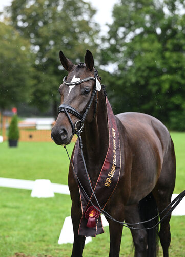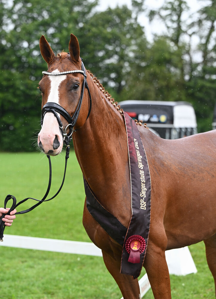 Zur DSP-Dressurqueen 2024 avancierte jedoch die Klassensiegerin der vierjährigen Dressurstuten, die ebenfalls eine völlig verdiente Gesamtnote von 8,42 erzielte: F-Grace St überzeugte sowohl in Typ als auch in den Noten für Schritt und Trab. So erhielt die Stute aus der Zucht von Alois Steidl und im Besitz von Dr. Jutta Steidl aus Eichstätt für Schritt, Trab und Gesamteindruck jeweils die 8,5. Ihr Typ wurde sogar mit einer glatten 9,0, der Tagesbestnote, belohnt. Im Trab ist das raumgreifende Vorderbein hervorzuheben, was durch ein geschlossenes Hinterbein komplettiert wird. „Eine sehr charmante Stute mit einem tollen Auge und äußerst vielversprechenden Grundgangarten“, lobte Katrin Burger. Insgesamt kann F-Grace St ihren Vater nicht verleugnen. Die Stute stammt vom KWPN-Körsieger, Doppel-Weltmeister, Weltcup-Sieger und frischgebackener Doppel-Bronzemedaillengewinner der Olympischen Spiele Glamourdale ab. Ihre Mutter Fabienne ist eine Staatsprämienstute vom Oldenburger Elite- und Hauptprämienhengst Fürstenball.