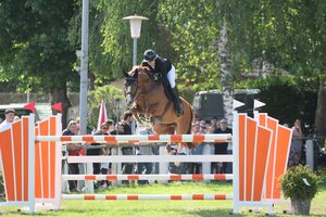 Birkhof's Arezzo Man sprang unter dem Sattel von Sophie Hinners zum Sieg in der Qualifikation der fünfjährigen Springpferde.  /  © Equitaris