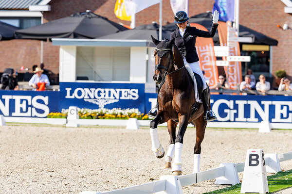 In Ermelo bei den Weltmeisterschaften der jungen Dressurpferde starteten heute die Sechsjährigen in ihre erste Qualifikation. Als Siegerin ging die DWB-Stute Valerie B vom Platz. Die Tochter des Revolution wurde gezogen von Karin und Peer Guldbrandsen und steht im Besitz der Helgstrand Dressage A/S. Anne Mette Strandby Hansen führte Valerie B zu einer Gesamtnote von 90,800%. Mit 89,200% folgten der gekörte Hannoveraner Hengst Segantini und Dorothee Schneider auf dem zweiten Rang. Der Sohn des Secret wurde von Dr. Christine Feichtinger gezogen und steht im Besitz von Maik Kanitzky.