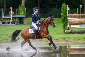 Im Anschluss an die Ponys hatte das recht überschaubare Starterfeld der sechsjährigen Vielseitigkeitspferde im kleinen Finale seine zweite Chance im Warendorfer Gelände. Diese nutzte, geritten von seiner Besitzerin Eva Terpeluk aus Ehingen, der Trakehner Asagao xx- Nachkomme Uni´s Brown Cookie (MV Summertime) aus der Zucht von Wolfgang Martin mit einer harmonischen Runde im Cross, die mit einer Wertnote von 7,8 und dem Sieg belohnt wurde. Die Zuchtstätte der Sportpferde vom Schwalbenrain steht in Baden-Württemberg für die erfolgreiche Zucht blütiger Vielseitigkeitspferde. Auf Platz zwei galoppierte mit der 7,4, vorgestellt von Svenja Eckert die Stolzenberg-Tochter Samira (MV Contendro I, Hann.) gezogen von der ZG Köpp und im Besitz von Helene von Roeder stehend. Die 7,1 brachte Bodo Battenberg und dem DSP-Champion DSP Quickstep von Quantensprung aus einer Dali X Mutter (B.: Ariane Wiedemann, Z.: Stefan Weyer) Platz drei im Ranking ein.