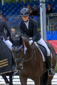 „Er ist einfach so gelassen, so locker und immer so brav“, schwärmte Michele Schulmerig. Und das traf es genau auf den Punkt oder wie das Richtertrio, bestehend aus Tim Koch, Dr. Carsten Munk und Jürgen Uthoff bestätigte: „Das Pony zeichnete sich durch eine gute bis sehr gute Losgelassenheit, eine sehr sichere Anlehnung, gute Dehnbereitschaft und immer eine sehr große Zufriedenheit aus“. Genau diese Zufriedenheit und hohe Rittigkeit zog sich in Kombination mit drei sehr reellen und qualitätvollen Grundgangarten durch die Prüfung. Der Trab zeigte sich losgelassen schwingend und immer im Gleichmaß. Teilweise, besonders in den Verstärkungen, war gerade in Hinsicht für eine noch höhere Note noch mehr Abdruck aus der Hinterhand wünschenswert (8,5). Eines der Highlights bildete der Galopp oder wie es Jürgen Uthoff in seinem Kommentar beschrieb: „Der Galopp präsentierte sich sicher ins Bergauf gesprungen bei immer gleicher Anlehnung und großer Zufriedenheit“. Der Lohn: die Wertnote 9,0. Für den taktsicheren Schritt mit gutem Vorfußen und Übertritt vergaben die Richter eine 8,5. Die Rittigkeit war, wie bereits erwähnt, genau der Punkt, mit welchen Goldschatz einfach brillierte. So griffen die Richter auch hier tief in die Notenkiste und vergaben eine 9,0. „Goldschatz hat sich heute wie ein Goldschatz präsentiert. Im Hinblick auf Qualität des Körperbaus und Typs ist es ein sehr korrektes Pony. In der Halsung vielleicht etwas tief angesetzt. Doch wir haben gesagt, dass dieses Pony im Hinblick auf die Präsentation der Grundgangarten sehr viel aus seinem Körper macht“, erläuterte Jürgen Uthoff. So erhielt der DSP-Ponywallach (Rheinland-Pfalz Saar) hier eine 8,5. Damit stand eine Endnote von 8,7 fest und bei Michele Schulmerig, ihrer Mutter und dem gesamten Team flossen die Tränen. Goldschatz machte heute wahrlich seinem Namen aller Ehre. Muss man bei ihm überhaupt irgendetwas beachten? Michele Schulmerig lacht: „Nein, nur genügend Zucker dabei haben“ und fügt hinzu: „Wir haben zu ihm eine ganz besondere Beziehung. Er ist bei uns geboren und meiner Mutter und mir ist er quasi in die Arme gefallen“. Eine wahrlich rührende Geschichte, wobei beim ersten Finale der diesjährigen HKM Bundeschampionate letztendlich gutes Reiten und höchste Zufriedenheit belohnt wurde!