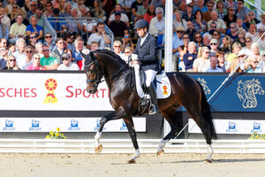 Finale, oho – ja, diesen Jubel hörte man vom Birkhof Team nach der Finalqualifikation der vierjährigen Hengste. „Wir sind hier angereist und hatten vom Finale geträumt. Dieses aber wirklich nicht erwartet“, beschreibt Anna Casper. In der Finalqualifikation hatten sich die beiden dann völlig überlegen an die Spitze gesetzt. „Ich glaube wirklich seine Art zeichnet ihn aus. Er ist so lieb. Er weiß schon, dass er Hengst ist und das zeigt er auch. Er ist immer bereit und motiviert. Ich mache auch gar nicht viel mit ihm. Er hatte den ganzen Winter Pause, da war ich mit ihm nur im Gelände und bin viel über Gymnastikreihen gesprungen. Das hat ihm glaube ich auch gutgetan. So ist er mit frischen Wind in das vierjährige Jahr zu gestartet“, erläutert Anna Casper und fügt hinzu „Er ist wie ein Lamm“. Diese Selbstsicherheit, dieses große Vertrauen zu seiner Reiterin überzeugte auch heute im Finale. Doch schlussendlich war er fast schon zu brav. So zeigte sich am Ende ein Positionswechsel an der Spitze: Der schwarzbraunen, aus ostfriesischem Stamm gezogenene Hannoveraner Lindenberg (v. Libertad-Destano, Z.: Sabine und Hans-Heinrich Maak) unter dem Sattel von Jakob Schenk zog am Birkhof-Dreamteam vorbei. Lindenberg setzte sich mit einer Endnote von 8,8 gegen Elocin durch (8,5). Dennoch eine wahrlich starke, gar silberne Leistung des sympathischen DSP-Hengstes Elocin.