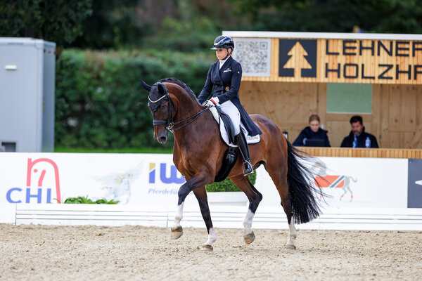 „Ich glaube, dass er nach dem Motto, er kam, sah und siegte, lebt“, lacht Dorothee Schneider und fügt hinzu: „Barcelo hat sehr viel Charme, viel Bewegungsdynamik, einen tollen Charakter und ist immer motiviert, was wir ja für unseren Sport unbedingt brauchen“. Genau diese beeindruckende Bewegungsdynamik spiegelte sich in der heutigen Trabtour der S**-Dressur auch wider. Toll kreuzende Trabtraversalen, dynamische Verstärkungen und insgesamt viel Gleichmaß überzeugten in der Trabtour. Der starke Schritt von Maxi Kraft’s Barcelo zeigte sich losgelassen schreitend mit viel Übertritt. Der versammelte Schritt zeigte sich nicht ganz taktsicher. Im Galopp brillierten die beiden mit gut zentrierten Galopppirouetten waren heute aber in den Serienwechseln vom Fehlerteufel begleitet. So schlichen sich sowohl in den Dreierwechsel als auch in den Zweierwechseln Fehler ein. In Summe standen 71,2 Prozent, was der Sieg vor Lena Haßmann mit BreFood’s Framework (69,3 Prozent) und der Amateurin Carolin Kilian mit Sarotti (67,5 Prozent) bedeutete. Besonders für Letztere ist dieser Erfolg auf internationalem Parkett und als Amateurin ein ganz besonderer Erfolg. Doch kommen wir noch einmal zu Maxi Kraft’s Barcelo: Er ist bereits für das Finale des Nürnberger Burg-Pokals qualifiziert und durfte in der internationalen Kleinen Tour von Donaueschingen noch ein wenig Prüfungsroutine sammeln – nicht zuletzt mit Blick auf das Burg-Pokal-Finale in der Frankfurter Festhalle. „Barcelo ist ein Pferd mit ganz vielen Möglichkeiten, tollen Grundgangarten und viel Talent zur Lastaufnahme – und dazu ist er auch noch schön“, resümierte Schneider.