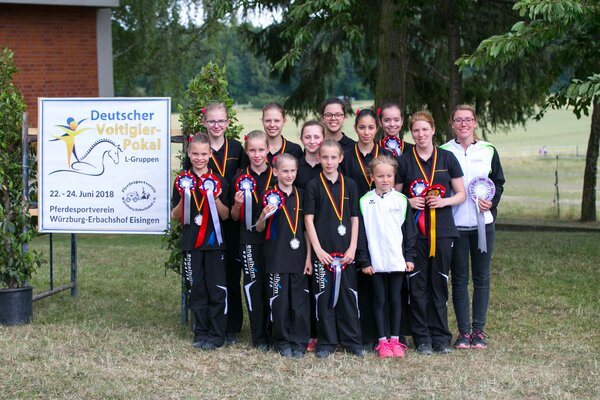 Eine Voltigiergruppe im Kola-Rausch: Auf dem Vereinspferd namens Kola wurde jetzt eine junge Gruppe des Reitervereins Schriesheim im bundesweiten Vergleich Zweiter beim Deutschen Voltigierpokal der so genannten L-Gruppen. In dieser Klasse tummeln sich durchaus Buben und Mädchen, die gerade erst in den Pferdesport einsteigen. Umso spannender ist es, wenn sich die jungen Pferderückenturner dem bundesweiten Vergleich stellen – wie jetzt die Schriesheimer. Das Team besteht aus Kindern und Jugendlichen im Alter von acht bis 16 Jahren. Die junge Voltigiergruppe mit ihren Trainerinnen Lena Handschuh und Ina Baier hatte sich zuvor auf Landesebene in Bietigheim-Bissingen mit einem Sieg für den Pokal qualifiziert.