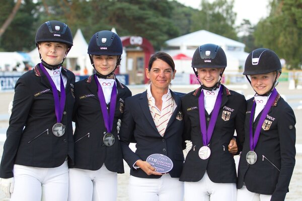 Erstmalig sendete Deutschland in diesem Jahr eine Dressur-Equipe bei den Children zu den Europameisterschaften. Und gleich war die Chance auf den obersten Podestplatz im Teamwettbewerb da. Isabelle Dülffer, Lisa Steisslinger und Kenya Schwierking legten vor. Alina Hahn aus Leonberg hatte es als Schlussreiterin in der Hand und bot der starken Konkurrenz aus den Niederlanden Paroli. Ihre Württemberger Stute Riana machte keinen Fehler, wirkte aber unter der Sonne Fontainebleaus nicht ganz so frisch wie bei der Einlaufprüfung. Mit starken 73,615 Prozent kamen die beiden ins Ziel. Deutschland hatte Silber gewonnen.