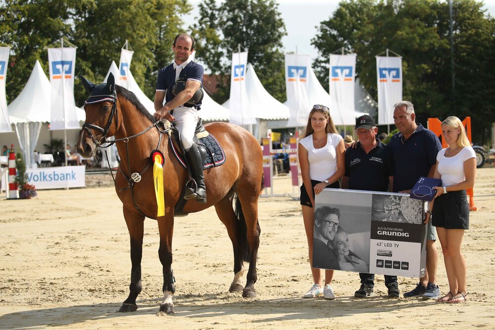 Doch einer, der in den letzten Wochen in Ausnahmeform unterwegs ist, setzt zur Aufholjagd an: Peter Hertkorn. Der Maschinenbautechniker aus Horb siegte in dem S** nach seinem mit der Holsteiner Stute Canturia und liegt nun in der Wertung auf Rang vier. Nach dem Erfolg im Großen Preis von Ichenheim ist ihm hier noch mehr zuzutrauen. Jochen Teufel und Arc en ciel de Gaia wurden Zweite, Tina Deuerer und Smint Dritte. Nach dem Sieg gestern musste Hansi Dreher heute mit Twenty Clary Federn lassen: Zwei Fehler warfen ihn weit zurück. (mos)