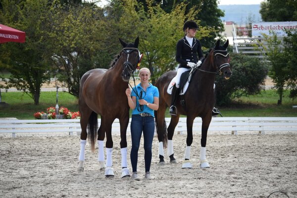 Die dreijährigen Stuten und Wallache traten heute Nachmittag auf der Kaiserwiese zu ihrer Reitpferdeprüfung an- die Wertungsprüfung zum DSP-Reitpferdechampionat. Im Starterfeld fand man lediglich zwei Pferde aus Bayern und eines aus Sachsen-Thüringen, die restlichen Pferde stammten aus der Landeszucht. Auf dem Landeschampionat in Tübingen noch hintereinander rangiert, teilten sich heute Die Landeschampionesse und der Vizechampion den Sieg. Mit einer Wertnote von 7,9 überzeugte Zoè (v. Zalando/Fürst Romancier) unter Besitzerin Ramona Ritzel die Richter. Die Stute stammt aus der Zucht von Josef Rief und erhielt lediglich auf die Ausbildung eine 7,5. Alle anderen Merkmale wurden mit einer glatten 8,0 bewertet. Ebenfalls mit der Endnote 7,9 rangierte Damian auf dem ersten Rang. Der Don Diamond/Sandro Hit Sohn aus der Zucht der ZG Blessing und in Besitz von Thomas Casper stehend, wurde von Anna-Lisa Schepper gekonnt in Szene gesetzt. An dritter Stelle rangierten wertnotengleich drei Pferde mit einer Endnote 7,8. Für die Landeszucht sind dies Felipe (v. Fürstenball/Scolari) unter Romy Sobotta (Z.: Resi Wörz, B.:horsePRO) und Fine Lady C (v. For Romance I/Rubin-Royal) unter Ines Knoll (Z.+B.: Hans Claus).