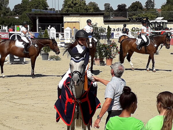 Erstmals seit es den KidsCup Baden-Württemberg gibt, hat eine junge Dame aus Hessen eine Qualifikation gewonnen: Die zehnjährige Amy Helfrich aus Viernheim auf dem Schimmelpony Matcho P. Die Tochter des früher international reitenden hessischen Profis und Reitstallbesitzers Gerhard Helfrich siegte als schnellste Reiterin im Stechen vor Chiara Ebrahimi vom Hofgut Meisterhaus auf Habanero und Cecilia Huttrop-Hage vom Hofgut Albführen auf Overfly; sie hatte im Normalparcours mit 8,8 die höchste Note. Das hochqualifizierte Richterteam bestand aus Wolfgang Brüninghaus, Peter Illert und Klaus-Peter Mettenbrink. Im KidsCup folgt jetzt noch eine Qialifikation in Ellwangen-Killingen vor dem Finale von Villingendorf Mitte September (rok).