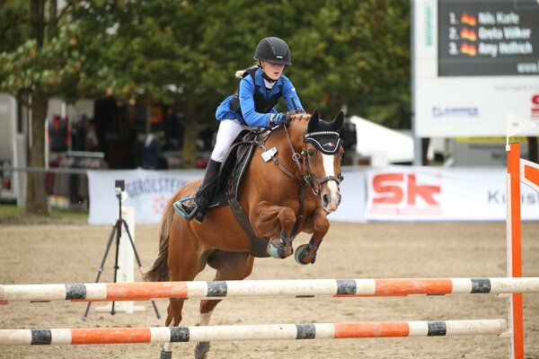 Spannender hätte es nicht sein können: Elisabeth Maria Geisinger entschied als letzte Starterin im Stechen das diesjährige Kids Cup Finale in Villingendorf für sich. Im Sattel ihres wie die Elfjährige selbst sagt „durchgeknallten“ Ponys Lorrell blieb sie doppel-null und brauchte lediglich 28.50 Sekunden für den finalen Stechparcours. Damit war Geisinger eine ganze Sekunde schneller als die Zweitplatzierte Greta Völker auf Chochmo gewesen. Die Trochtelfingerin gehörte mit der Wertnote 8,3 bereits zu den Stärksten im Umlauf. Platz drei ging an Vanessa Kölz auf FST Livius, vor Cecilia Huttrop-Hage mit ihrem Pony Overfly auf Platz vier. Der Umlauf-Stärkste mit 8,5 Nils Karle zeigte im Stechen den schnellsten Vier-Fehler-Ritt auf seiner Golden Girl. Die Zeit der Siegerin hätte der Schüler von Tante Verena Karle gehabt. Der Fairness-Preis in Form eines Fahrrads ging an den stark reitenden Oliver Schon. Mit seinem Pony Nougat hatte er im Umlauf einen ärgerlichen Fehler gehabt und es deshalb nicht ins Stechen geschafft. Sein vorbildiches Verhalten abseits des Parcours wurde so dennoch gewürdigt. (akb | Foto: D. Matthaes)