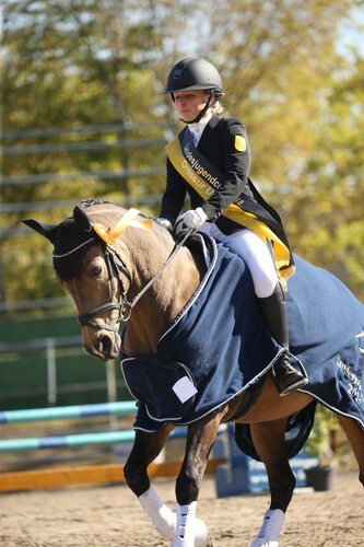 Bei der U16-Wertung in der Dressur des Landesjugendcup-Finales ist es in Pforzheim denkbar spannend geworden: Malin Kampp aus Obersulm, Schülerin von Sandy Kühnle, siegte im Sattel ihres Ponys Edelmanns Captain Jack Sparrow mit 8,2 und damit einem Zehntel Vorsprung vor der aus Südbaden stammenden Lara Sophie Klasen auf Timms Halunke - die U14-Siegerin konnte ihre Form vom Vortag nicht ganz halten, wurde aber trotzdem zur erfolgreichsten Dressurreiterin des Finalturniers. Auf dem dritten Platz landete Josephine Binders schülerin Emelie Ellinger aus Münchingen auf ihrem Rappen Gandalf (rok/Foto: Doris Matthaes).