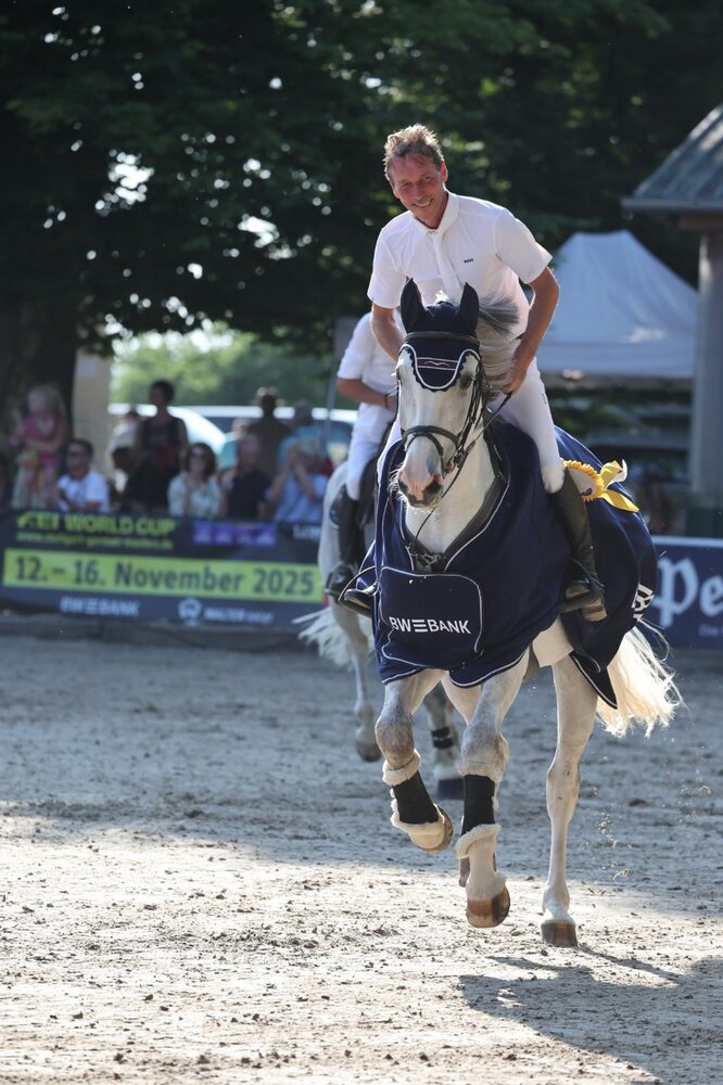 Nun sollte es aber so richtig spannend werden. Für die erste Qualifikation hatte der amtierende Hallenchampion Hansi Dreher seinen routinierten Cous Cous gesattelt. In gewohntem Stil und engsten Wendungen legte er das Stechen an. Mit seinem großen Grundgalopp macht der Schimmel nicht nur ordentlich Meter, sondern war mit 42,25 Sekunden auch noch deutlich schneller als der bislang Führende Schill gewesen. Doch nicht nur Dreher hatte einen schnellen Schimmel für das Stechen parat: Armin Schäfer jun. ließ seinen ehrgeizigen zehnjährigen Dante ordentlich galoppieren. Mit bester Manier durchquerten sie nach 43,14 Sekunden die Ziellinie. Nicht ganz für die Führung gereicht, war es am Ende immer noch der zeite Platz, über den sich Schäfer freuen durfte. Mit etwas viel Schwung in die Kombination kam die nächste Amazone. DSP Claus Peter hatte Alia Knack gesattelt und musste schlussendlich einen Abwurf an der Kombination in Kauf nehmen. Ebenfalls ein Wörtchen mitsprechen in diesem jahr möchte Sascha Braun. Erneut auf seine Emmylou Balou Z gesetzt blieb auch er fehlerfrei in 44,83 Sekunden. Am Ende der fünfte Rang. Denn vor Braun und Schill schob sich Thomas Mang in das Gesamtklassement. Mit seiner Grand Zara ritt er eine feine Stechrunde und setzte sich auf den dritten Rang. Dann waren es noch zwei, die Dreher den Sieg nehmen konnten. Doch sowohl Marcel Marschall als auch Kai Ruggaber und sein Mr. Newman mussten einen Abwurf in Kauf nehmen.