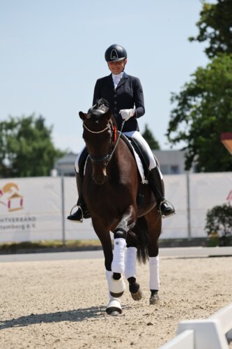 Passend zum Sommerwetter gab es bei den sechsjährigen Dressurpferden echtes Urlaubsfeeling, ja Mallora-Feeling. Nein, Spaß beiseite. Bei den sechsjährigen Dressurpferden gab es um den Sieg in der Dressurpferde M und damit verbunden den Titel „Landeschampion der sechsjährigen Dressurpferde“ ein enges Kopf-an-Kopf-Rennen. Schlussendlich hatte die aus dem Zuchtgebiet Brandenburg-Anhalt stammende DSP-Stute Mallora (Morricone-Fürstenball, Z.: Landwirte Jung, B.: Gestüt Greim) unter dem Sattel von Ilsemarie Philipp die Nase vorn (8,16). Schon im vergangenen Jahr hatte sich die langbeinige Stute für das Bundeschampionat qualifiziert und sich dort im kleinen Finale eine Schleife gesichert. In Weilheim überzeugte Mallorca in allen drei Grundgangarten mit viel Gleichmaß und Taktsicherheit. Der Trab präsentierte sich aktiv abfußend und schwungvoll. In der ersten Trabverstärkung gab es einen kleinen Taktfehler. Auch die Seitengänge gelangen gleichmäßig (8,3). Der Schritt präsentierte sich mit viel Übertritt und gut an die Hand schreitend (8,6). Der gut ins Bergauf gesprungene Galopp wurde mit der glatten 8 bewertet. In der Rittigkeit machten neben dem Taktfehler in der ersten Trabverstärkung ein nicht ganz williges Rückwärtsrichten und ein etwas übermotiviertes Angaloppieren aus dem Schritt Abstriche (7,8). In der Perspektive gaben das Richtertrio, bestehend aus Michaela Grupen, Holger Martin und Tim Koch, eine 8,1. Mit einer Endnote von 8,16 qualifizierte sich Mallorca vom Gestüt Greim erneut für die Bundeschampionate. Über den Titel „Landeschampion der sechsjährigen Dressurpferde“ freute sich aber ein guter Bekannter. Der letztjährige Landeschampion der fünfjährigen Dressurpferde, Fred the Red, erweiterte unter seinem Reiter Christian Lanterdinger, seine Medaillensammlung und sicherte sich den heißbegehrten Titel. Fred the Red (Floriscount-Lord Leopold, Z.: Josef Staudenmayer, B.: Dressurstall Amberhof) wurde im vergangenen Jahr neben dem Landeschampion-Titel auch Vizechampion bei den DSP-Championaten und hatte die Bundeschampionate in Warendorf mit einer Platzierung im kleinen Finale abgeschlossen, damals noch unter dem Sattel von Anna-Louisa Fuchs. Nun hat der Wallach den Besitzer und auch Reiter gewechselt. In Weilheim bestach der sympathische Fuchswallach ebenso mit viel Gleichmaß. „Ein Pferd das sich zweifelsohne schwungvoll präsentierte, wobei heute im Trab die letzte Frische fehlte“, erläuterte Tim Koch (7,5). Ein echtes Highlight bildete der Schritt, großzügig durch den Körper schreitend (9,0). Auch der Galopp präsentierte sich gut ins Bergauf gesprungen. „Hier hätten wir uns auf allerhöchsten Niveau gewünscht, dass er noch etwas mehr in Versammlung präsentiert wird“, erläuterte Tim Koch und vergab für den Galopp eine 8,2. In der Rittigkeit machte unter anderem ein Angaloppieren in der Einleitung der Trabverstärkung Abstriche (7,8). In der Note für Perspektive vergaben die Richter eine 8,0, was eine Endnote von 8,1 ergab. Damit hatte Fred the Red unter dem Sattel von Christian Landertinger nicht nur den Titel des Landeschampion der sechsjährigen Dressurpferde sicher, sondern ebenso das Ticket für das Bundeschampionat. Dieses haben auch die drei Pferde, die punktgleich auf Rang drei, folgten. Das sind Vivanti (Vitalis-Sir Donnerhall, Z.: Josephine Binder, B.: Julian Bertz) vorgestellt von Antonia Goldbeck, Didi Veron (Don Martillo-Sir Oldenburg, Z.: Simone Koppenhöfer, B.: Gabriele Klössinger) vorgestellt von Lisa-Maria Klössinger und Fabulous Fenja (Fair Game-Lord Leopold, Z.: Thomas Casper, B.: Thomas Casper) vorgestellt von Anna-Lisa Schepper. Alle drei Pferde erhielten die Note 8,0.