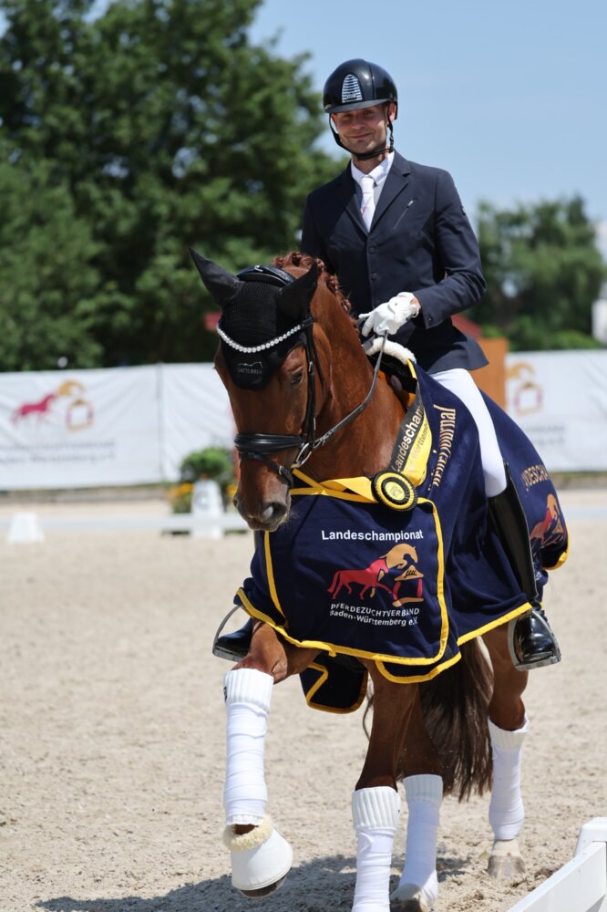 Der Morgen bei den Landeschampionaten in Weilheim/Teck startete mit der Finalentscheidung bei den fünfjährigen Dressurpferden. Hier erlebte man eine Geschichte, die sich wohl jeder Züchter und Pferdebesitzer erträumt. Nikolaus Kühn hat den fünfjährigen Fürst Magic-Sohn For Magic K (Fürst Magic-De Niro, B.: Irmgard Berendsen) selbst gezogen, ausgebildet und nun zum Landeschampion geformt. Eine traumhafte Geschichte, ja die Runde der beiden in Weilheim glich auch einer Traumrunde. „Das war eine tolle Prüfung“, lobte das Richtertrio, bestehend aus Sonja Pilton, Michaela Grupen und Tim Koch und fügte hinzu: „Gleich der Arbeitstrab präsentierte sich dynamisch und kraftvoll abfußend bei guter Schulterfreiheit“. Zudem überzeugten das hohe Gleichmaß und Taktsicherheit. Einen kleinen „Schönheitsfehler“ gab es als For Magic K in der ersten Volte kurz angaloppierte, aber direkt wieder einen energisch abfußenden Trab fand. Im Trab vergaben die Richter verdient die Note von 8,8. Der Schritt präsentierte sich gut schreitend mit ordentlichem Über- und Vortritt (7,8). Für eine noch höhere Note könnte der DSP-Wallach hier noch mehr aus der Schulter kommen. Die Dynamik aus dem Trab zog sich auch im Galopp durch und so zeigte sich dieser kraftvoll ins Bergauf springend (8,2). „Das Pferd besticht auch durch seine innere Gelassenheit und Losgelassenheit. Wir haben auch eine zufriedene Anlehnung gesehen“, erläuterte Tim Koch. Auch im gesamten zeigte sich For Magic K sehr sicher, was in der Rittigkeit zu einer 8,3 führte. Diese Note vergaben die Richter auch im Gesamteindruck, woraus eine Endnote von 8,28 resultierte. Das bedeutete nicht nur den Titel „Landeschampion der fünfjährigen Dressurpferde“, sondern ebenso das Ticket für die Bundeschampionate.
