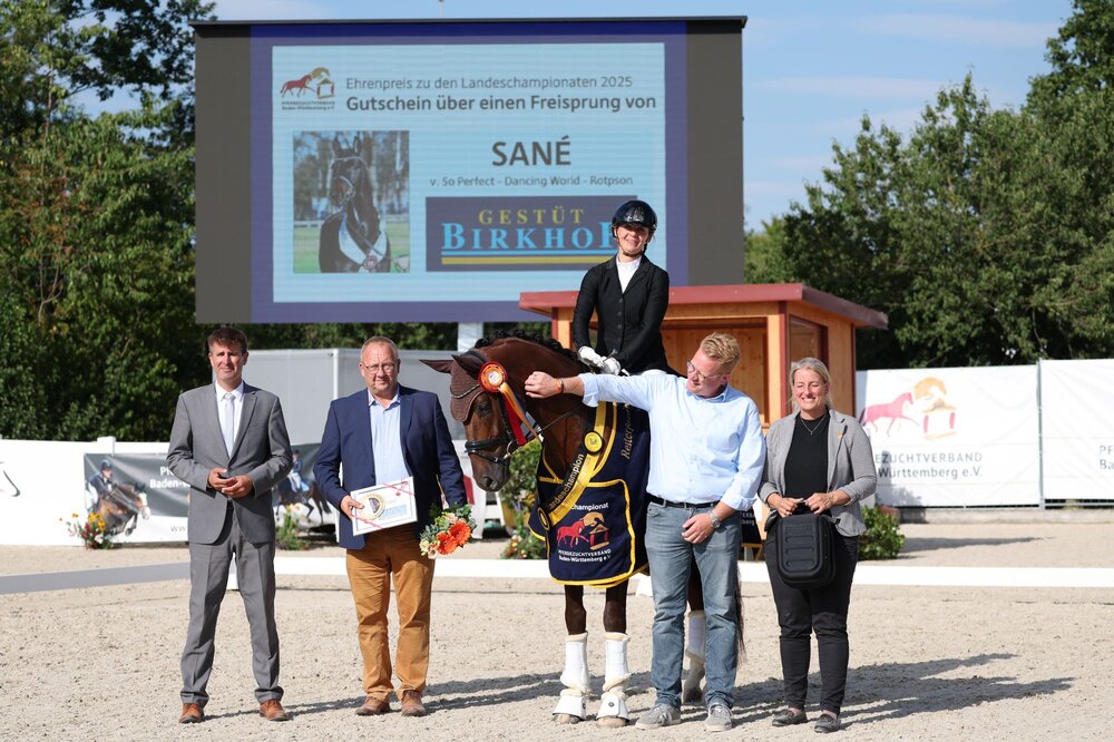 Wow, was war das für ein Finale bei den vierjährigen Stuten und Wallache. Gleich die erste Gruppe setzte große Ausrufezeichen, wobei auch aus dieser Gruppe der spätere Landeschampion stammen sollte. Die Rede ist von Valentin. Der Va Bene-Nachkomme stammt aus der Zucht der Züchtergemeinschaft Nadine und Carsten Grill und wurde meisterlich von seiner Besitzerin Bianca Huber vorgestellt. „Im Trab begeisterte Valentin mit hoher Elastizität, schön spurend und immer in der Balance. Getoppt wurde das noch einmal im Galopp, wo sich genauso wie im Trab ein kraftvolles Abfußen zeigte. Zudem präsentierte sich der Galopp gut ins Bergauf gesprungen“, lobte Holger Martin, der das Finale der vierjährigen Stuten und Wallache gemeinsam mit Michaela Grupen richtete. Im Trab stand die Note 8,5. Den Galopp bewerte das Richterduo mit der Traumnote 9,0. Auch der Schritt zeigte sich raumgreifend schreitend. Dabei sollte ein kleine Stockung bei B keine Abstriche machen (8,5). Die gute Balance, hohe Taktsicherheit und das harmonische Seitenbild führte in der Note für die Rittigkeit zu einer 8,5. Aus der Qualifikation nahm Valentin die Note von 8,0 für das Exterieur mit, was eine Endnote von 8,5 ergab. Das sollte bis zum Schluss in einem wahrlich stark besetzten Starterfeld für die den wohlverdienten Sieg reichen. Einen tollen Abschluss eines mehr als erfolgreichen Tages fand auch Julia Kühn. Nach den Titeln bei den fünfjährigen und siebenjährigen Dressurpferden stellte die Familie Kühn mit der For Dance-Tochter Florine (For Dance-Disco Tänzer, Z.: Werner Häfner, B.: Stall Kühn) auch die Vizechampionesse bei den vierjährigen Reitpferden. Dabei wusste die sympathische Stute unter dem Sattel von Julia Kühn besonders in puncto Losgelassenheit und damit verbunden in der Rittigkeit zu überzeugen. „Wir möchten mit der Note für die Durchlässigkeit beginnen. Florine präsentierte sich sehr gleichmäßig in der Anlehnung und zeigte sich sehr zufrieden gehend. Alleine dieser Eindruck erzeugt Harmonie, was wir mit einer 9,0 bewertet haben“, erläuterte Holger Martin. Auch die Grundgangarten wussten zu überzeugen. Der laut Holger Martin schöne Bewegungsablauf in Trab und Galopp wurde jeweils mit einer 8,5 belohnt. Im Schritt hätte man sich heute ein noch großzügigeres Vorfußen gewünscht (8,0). Im Exterieur stand die Note 8,0, was eine Endnote von 8,4 ergab. Doch der Silberrang wurde noch ein weiteres Mal vergeben. So darf sich auch Glamorous Gigi (Global Player-Hofrat, Z.: Verena Lang-Wengert, B.: Thomas Casper) als Vizechampionesse bezeichnen. Nicola Haug stellte die vielversprechende Stute vor, wobei die Global Player-Tochter vor allem im Trab brillierte. Dieser präsentierte sich kraftvoll abfußend und mit einem hohen Gleichmaß (9,0). Ebenso super ausbalanciert und gut ins Bergauf springend zeigte sich der Galopp (8,5). Für den gut durch den Körper schreitenden Schritt mit gutem Vor- und Übertritt vergaben die Richter eine 8,5. Die Endnote von 8,2 wurde durch die Noten für die Durchlässigkeit (8,0) und das Exterieur (8,0) komplettiert. „Insgesamt wünschen wir uns den Ganaschenwinkel teilweise etwas geöffneter“, erläuterte Holger Martin. Die Siegerin der Einlaufprüfung, Daydream (Don Juan de Hus-Tomahawk, Z. u. B.: Sabine Reisenauer) vorgestellt von Ines Fleischmann, folgte im Finale auf Rang vier (8,3).