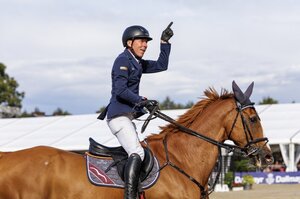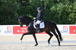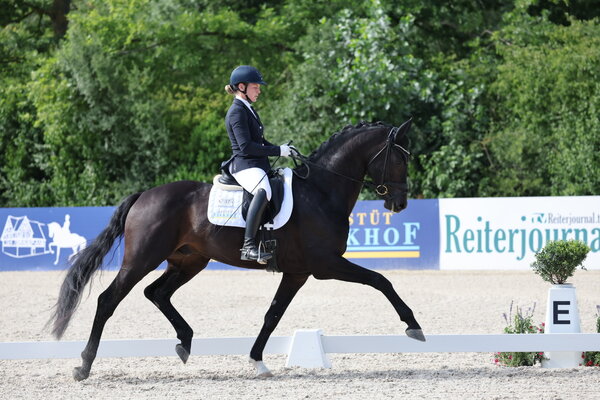 Mit Spannung wird alljährlich die Konkurrenz der drei- und vierjährigen Hengste erwartet. Dieses Jahr gingen zwei dreijährige und ein vierjähriger Hengst im Finale. Zum Champion wurde der „Älteste“ im Bundes gekürt: Birkhof’s Sané, der Sohn des So Perfect aus einer Dancing World-Mutter. Der imposante Rappe stammt aus der Zucht von Johannes Gaab und steht im Besitz von Thomas Casper. In Szene gesetzt wurde er wahrlich meisterlich von Nicola Haug. Schon in der Einlaufprüfung war den beiden eine wahre Traumrunde gelungen. Und, was soll man sagen? Genau die gleiche Traumrunde gelang Birkhof’s Sané und Nicola Haug auch im Finale oder wie es Holger Martin erläuterte: „Um dieses Pferd müssen wir uns glaube ich keine Sorgen machen. Wer gestern schon dabei war, hat gesehen, dass dieser Hengst traben kann. Das hat er heute wieder gezeigt“. Der Trab mit toller Mechanik und hoher Taktsicherheit wurde mit der glatten 9 bewertet. Der Galopp ist ebenfalls in Bergauf angelegt und präsentierte sich kraftvoll durchspringend sowie schon gut ausbalanciert (8,5). „Der Schritt zeigte sich grundsätzlich geregelt und gut räumend. Für eine noch höhere Note könnte er vielleicht noch mehr durch den Körper schreiten“, erläuterte Holger Martin (8,0) und fügte die Note für die Rittigkeit hinzu: „Die tolle Vorstellung vom Nicola Haug führte in der Rittigkeit zu einer Note von 9,0“. Die Note für das Exterieur nahm der bildhübsche und toll proportionierte Hengst mit einer 9,5 aus der Einlaufprüfung mit, woraus eine Endnote von 8,8 resultierte. Damit befand sich Birkhof’s Sané wahrlich in einer eigenen Liga und durfte sich verdient die Siegerschärpe im Landeschampionat der vierjährigen Hengste umhängen.