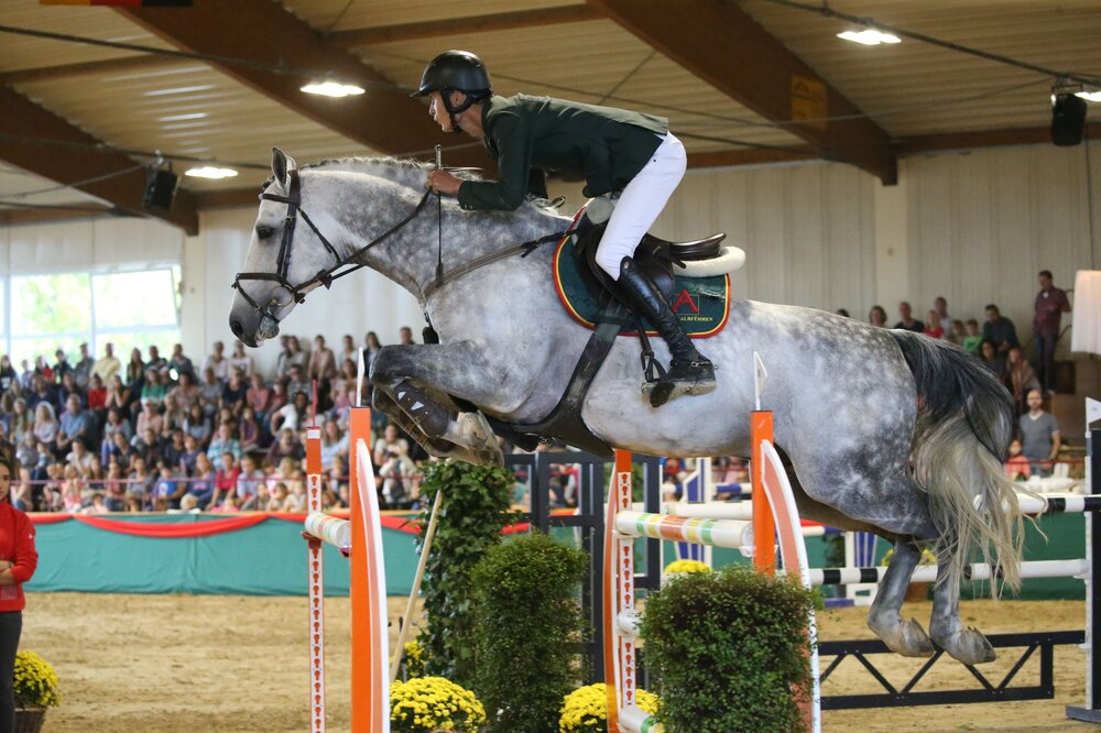 Alles Müller, oder was? Das fragten sich am Samstagabend die Besucher in der Reithalle von Mannheim-Neckarau: Marian Müller, Pferdewirtschaftsmeister in Diensten des Gestütes Albführen, war im Zwei-Phasen-S-Springen eine Klasse für sich. Im Sattel der Schimmelstute Coala Queen belegte er Rang eins, mit dem Hengst Coupe d'Alb Rang zwei der Prüfung. Dritte wurde Verena Kölz mit Landor vor Leonie Jonigkeit, der Deutschen Vize-Berufsreitermeisterin, auf Quilibria und Candino und Maximilian Ertz auf Curli. Der Jung-Profi, der aus Mannheim-Neckarau stammt und als Junger Reiter im Landeskader erfolgreich war, startet mittlerweile als Chefbereiter des Turnierstalles Müller in der Rhön (rok/Foto: Doris Matthaes)-