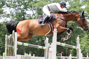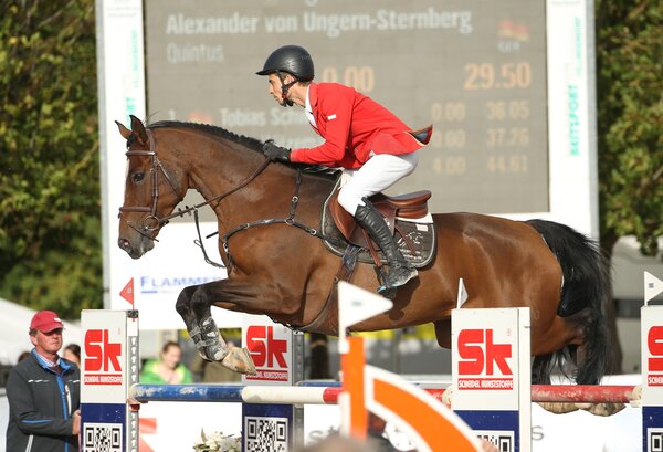 Alexander von Ungern-Sternberg vom Reitzentrum Taubenberg bei Lindau war der überragende Reiter beim Turnier in Friedrichshafen-Ailingen am Bodensee. Im Sattel seines elfjährigen Holsteiners Quintus siegte er in beiden S-Springen des Turniers. Im Großen Preis am Sonntag verwies er den Benzenbühler Andreas Groß mit Nininjo auf Rang zwei und platzierte selbst den Württemberger Flügel aus der Zucht von Nicole Göser auf Rang drei (rok/Foto: Matthaes).