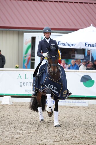 Die Serie für Nachwuchs-Grand-Prix-pferde ist 2025 in ihre 19. Saison gestartet. Dabei kann die Serie auf eine beachtliche Bilanz blicken: Von den bisher 18 Finalsiegern haben bereits sechs bei Olympischen Spielen teilgenommen. Auch die Olympiasiegerin Jessica von Bredow-Werndl setzt in dieser Saison im Louisdor-Preis eines ihrer großen Nachwuchshoffnungen ein. Die Rede ist vom zehnjährigen Grand Galaxy Win-Nachkommen Got it BB. Der Wallach zählt bereits seit fünf Jahren zur „Aubi-Familie“. Das Paar hat schon einige Siege und Platzierungen auf Inter II-Niveau gesammelt und wird in der Louisdor-Preis Finalqualifikation den nächsten Schritt in den Grand Prix-Sport nehmen. In der Einlaufprüfung zur morgigen Qualifikation überzeugten Jessica von Bredow-Werndl und Got it BB mit leichtfüßigen Passagen sowie aktiv abfußenden Piaffen im erlaubten Vorwärts. Im Galopp bildeten unter anderem die gut ins Bergauf gesprungenen Einer- und Zweierwechsel ein Highlight. Aber auch die Galopppirouetten gelangen gut zentriert, hätten für noch höhere Noten in ihrem Durchsprung noch flinker sein dürfen. Alles in allem setzten sie sich mit 71,15 Prozent gegen Helen Langenhanenberg mit dem in Baden-Württemberg und Bayern bestens bekannten DSP Danny Cool (71,13 Prozent) durch. Die beiden Paare trennte nur ein halber Punkt! Ab dem Anreiten dreijährig, über dreimal Gold bei den DSP-Championaten, die Qualifikation für die Bundeschampionate mit 9,4 und den Gewinn von Silber in Warendorf bis zum Dressurpferde-WM-Finale der Sechsjährigen lag die Ausbildung von DSP Danny Cool in den Händen von Lisa Volpp und Sebastian Horler. 2023 belegte DSP Danny Cool unter dem Sattel von Helen Langenhanenberg im Finale des Nürnberger Burgpokals Platz drei. Im vergangenen Jahr meisterten die beiden den Sprung in die Königsklasse und überzeugten heute mit leichtfüßigen Trabtraversalen, gut ausgehaltenen Passagen und weit nach vorne gesprungenen Serienwechseln. Teuer wurde es im Übergang zur ersten Piaffe, als der zehnjährige Wallach nicht gleich in die Piaffe fand. Die zweite Piaffe gelang dann stark verbessert. Dr. Annabel Frenzen belegte mit Szechuan (69,6 Prozent) Rang drei. Thomas Wagner mit Escolar’s Emil (69,5 Prozent), Julia de Ridder mit Birkhofs Diamantinos (69,3 Prozent) und Josephine Rosen mit Mister JR (68 Prozent) sicherten sich ebenso eine Platzierung.