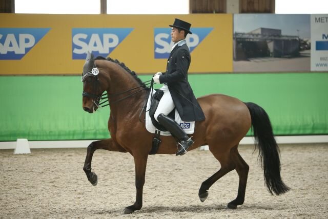 Young Shik Hwang, der in Albstadt trainierende Südkoreaner, siegte am Samstag auch im Kurz-Grand-Prix von Walldorf. Wieder kam der Landesmeister aus der Schule von Olympiasieger Martin Schaudt mit seinem Despino auf fast 72 Prozent der Punkte, diesmal kam Dr. Susan Konrad mit ihrer Stute Siena am nächsten dran - sie wurde Zweite vor Christoph Niemann mit Daddys knows best und Donna Felice. Erneut einen guten Eindruck hinterließ Martina Steisslinger auf ihrem dynamischen Holländer Flavory, sie wurde Fünfte (rok/Foto: Doris Matthaes)