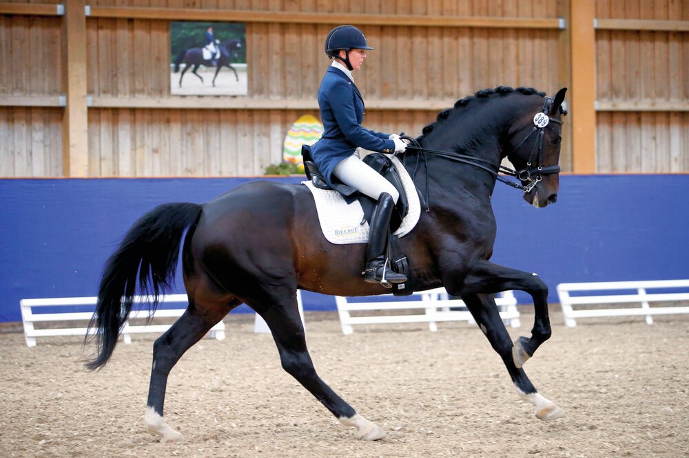 Zalando, der neunjährige Oldenburger, Sohn des Zack, ist fit für einen Start im Nürnberger Burg-Pokal der jungen Dressurpferde. Beim Dressurturnier in Walldorf bewährte sich der Birkhof-Vererber sogar eine Klasse höher und siegte in der Intermediare I - das war unter seiner Ausbilderin Nicole Casper der erste Zwei-Sterne-Sieg. Für die Vorstellung des großen Dunkelbraunen vergaben die Richter über 71 Punkte. Nicole Casper will mit Zalando auf dem Mannheimer Maimarkt in die Nürnberger-Burg-Pokal-Saison starten (rok/Foto: Doris Matthaes).