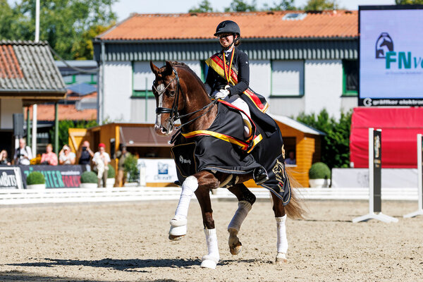 Was war das für ein toller Sport?! Und das Schönste: Erneut wurde losgelassenes und harmonisches Reiten belohnt oder wie es Kommentatorin Nicole Nockemann treffend auf den Punkt brachte: „So viel Symbiose, Leichtigkeit und Harmonie – das ist doch das, was unseren Sport so wunderbar macht“. Allen voran lieferten sich die späteren Medaillenträger ein beeindruckendes Kopf-an-Kopf-Rennen, wobei der Hannoveraner-Hengst Sky sich schlussendlich durchsetzte. Der Prämienhengst von 2020 und letztjähriger Bundeschampionats-Finalist, wo er übrigens schon die beste Trabnote erhalten hatte, lieferte unter dem Sattel von Ann-Kathrin Lachemann eine wahre Traumrunde. Dabei hat Sky (v. Sezuan-Sir Donnerhall I, Z. Gestüt Neff/Sandra Grede, B. Gut Schönweide) das Bewegungstalent seines Vaters Sezuan geerbt. „Was ist das denn für ein Trab und Galopp – So viel Dynamik und Aktivität bei natürlichem Grundtrab und Harmonie, das ist schon wirklich ausgezeichnet“, begann Nicole Nockemann ihren Kommentar. Beeindruckend war dabei vor allem, die Leichtigkeit und Taktsicherheit in jeglichem Tempi (9,2). Noch tiefer griffen die Richter im Galopp in die Notenkiste. Erneut mit viel Schulterfreiheit ausgestattet und energisch ins Bergauf springend, erhielt Sky hier eine 9,5. Ein kleiner Wehmutstropfen bildete der Schritt, der sich zwar losgelassen schreitend zeigte, jedoch aus der Schulter begrenzt und auch im versammelten Schritt nicht immer ganz ausbalanciert (7,8). Insgesamt brillierte die Runde mit Leichtigkeit und Selbstverständlichkeit, gar war es eine Traumrunde aus einem Guss. Highlights bildeten dabei auch unter anderem die mit einer guten Lastaufnahme versehenen Galopppirouetten sowie die schnurgeraden und toll ins Bergauf gesprungenen Serienwechsel. So gab es in der Note für die Durchlässigkeit verdient die 9,0. Im Gesamteindruck stand eine 9,3, was für die Qualität 89,6 Prozent ergab. Auch in der technischen Note lieferten die beiden das Tagesbestergebnis von 77,2 Prozent, was zu einem Endergbnis von 83,4 Prozent führte. Insgesamt muss auch die gefühlvolle Vorstellung der gebürtigen Baden-Württembergerin hervorgehoben werden, die Sky folgendermaßen beschreibt: „Sky zeichnet sein Charakter aus. Er hat ein Herz aus Gold und ist wirklich einzigartig“. Aktuell wird Ann-Kathrin Lachemann vom Co-Bundestrainer Hendrik Lochthowe trainiert. Sie wird aber auch immer wieder von ihrem langjährigen Trainer Oliver Luze unterstützt.