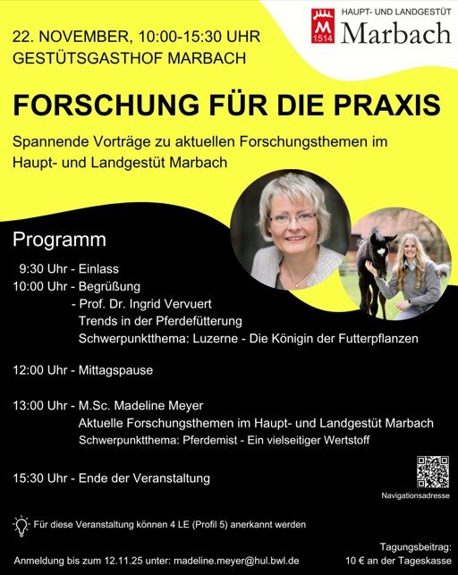 Nach der Mittagspause wird Madeline Meyer, wissenschaftliche Mitarbeiterin im Haupt- und Landgestüt Marbach, einen Überblick über die laufenden und abgeschlossenen Forschungsprojekte des Gestüts geben – von Studien- und Meisterarbeiten bis hin zu mehrjährigen Forschungsprojekten. Themenschwerpunkte sind unter anderem die nachhaltige Verwertung von Pferdemist, aktuelle Projekte zur alternativen Ampferbekämpfung sowie Untersuchungen zu Sozialboxen für Hengste.