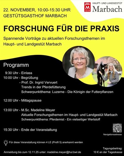 Am Samstag, 22. November, findet im Gestütsgasthof Marbach die Veranstaltung „Forschung für die Praxis“ statt. Pferdebesitzer, Betriebsleiter und alle Interessierten erhalten spannende Einblicke in die vielfältigen Forschungsaktivitäten des Haupt- und Landgestüts Marbach. Praxisrelevante Erkenntnisse aus aktuellen Forschungsprojekten, insbesondere aus der Pferdehaltung, werden anschaulich vermittelt.